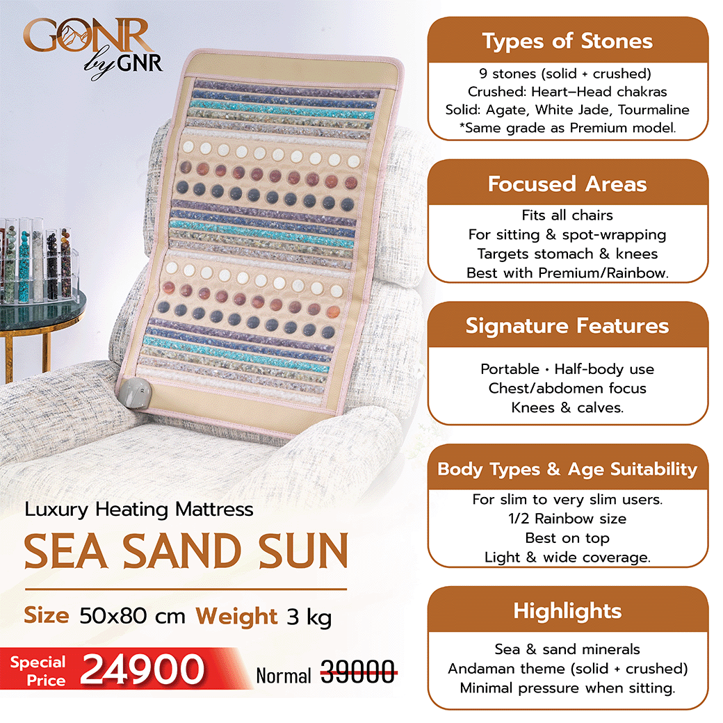 Model: For Using on an Office Chair/ For Relaxing and Able to use with other GONR models for half the length of the body. / Size: 50 x 80 x 1.7 cm. / Weight 3 kg. / 9 Types of Stones