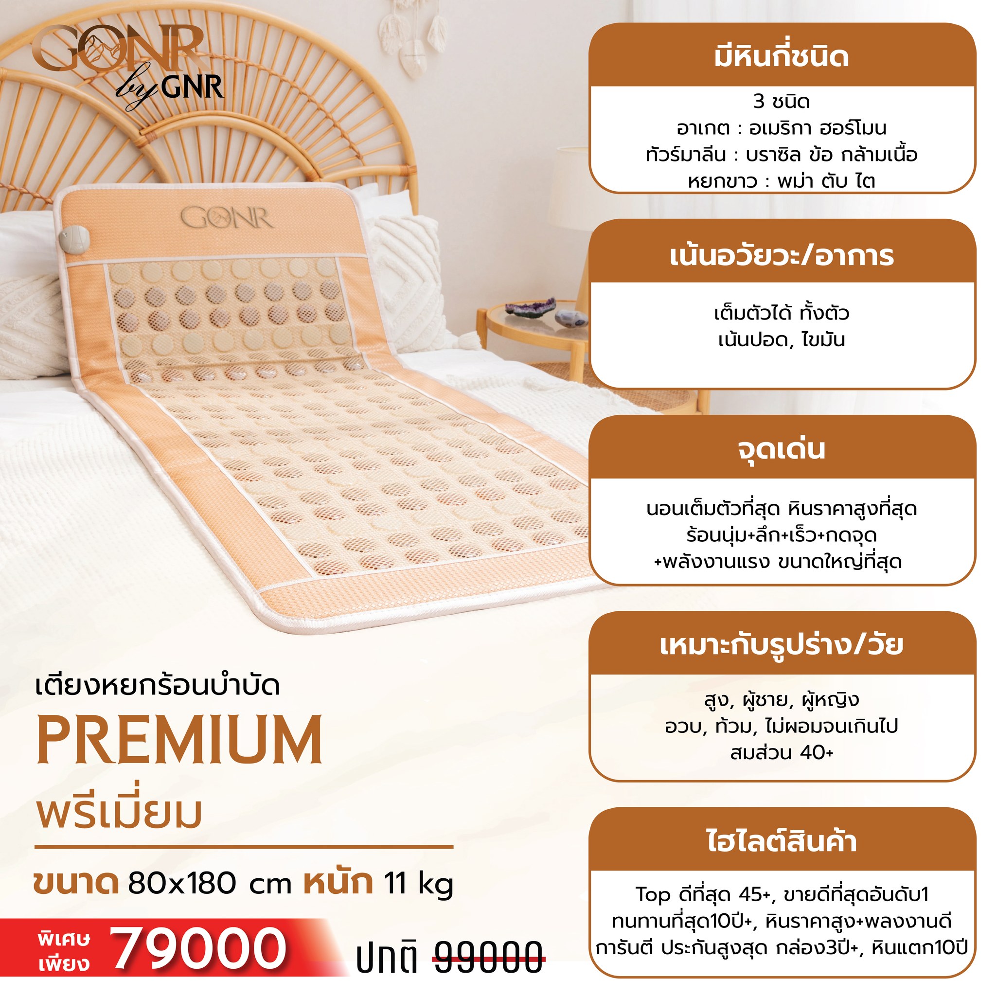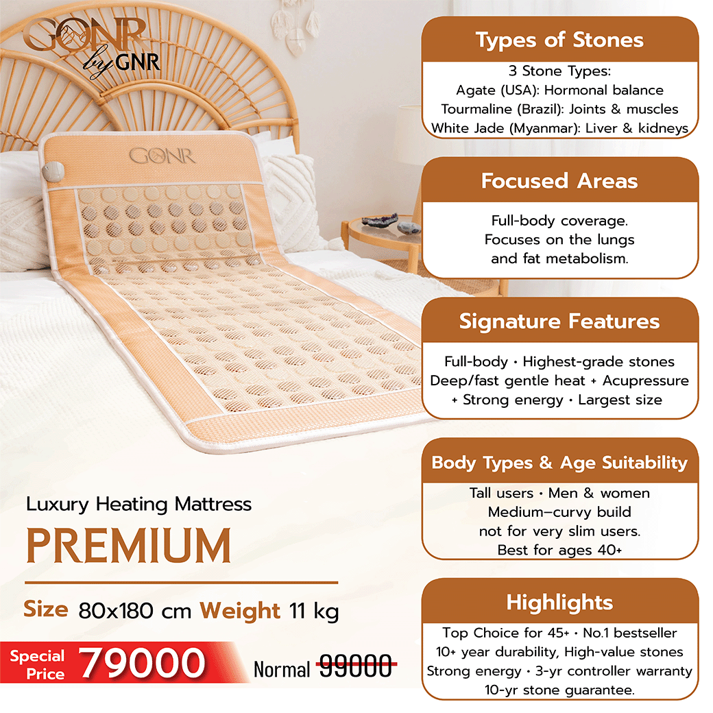 Model: Bed-type Heating Mattress, used in clinics and spas / Size 80 x 180 x 2.2 cm. / Weight 11 kg. / 3 premium-graded stones